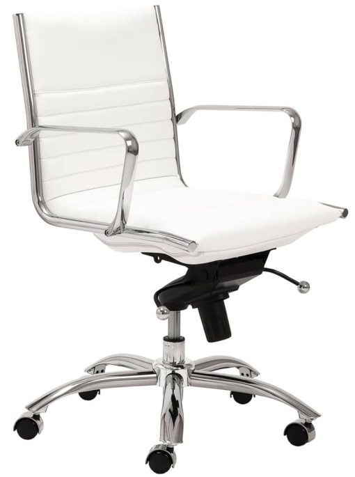 euro style 00674wht dirk low back office chair in white w/ chromed steel base high back or low, armrests or not, the dirk office chair design is very popular for all the right reasons. the seat and back are constructed into a single piece for a finished look, while inside the seat and back are flat bungie bands which offer an outstanding level of comfort that is famous worldwide. with stunning design and a variety of color options, the dirk is perfect for any office space. features soft leatherette over foam seat and back flat bungie band construction inside seat and back chromed aluminum armrests tilt mechanism with 5 locking positions chromed steel frame and base bifma approved contract grade california customers: proposition 65 warning warning: cancer and reproductive harm www.p65warnings.ca.gov show more
