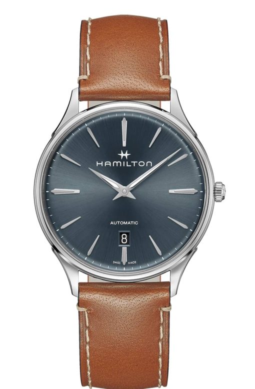 hamilton h38525541 jazzmaster thinline auto blue dial brown leather watch, 40mm with the jazzmaster thinline automatic, you can create a hamilton timepiece tailored to suit your style. there are four different dial and strap color combinations to choose from so you can change your strap to suit your mood and a choice of tan, black and olive green straps available. california customers: proposition 65 warning warning: cancer and reproductive harm www.p65warnings.ca.gov show more
